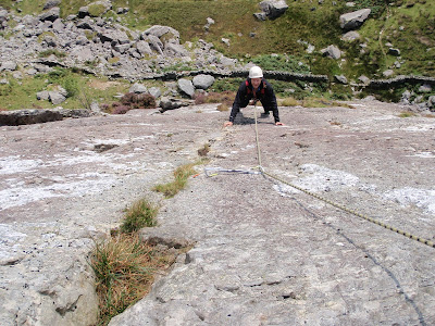At the top of the route we abseiled down a gully and then descended to the foot of the buttress for lunch and then an ascent of the Rowan route, another Diff, followed by an other abseil. We'd been lucky with the weather, which whilst ever threatening only delivered a few spots of rain all day.