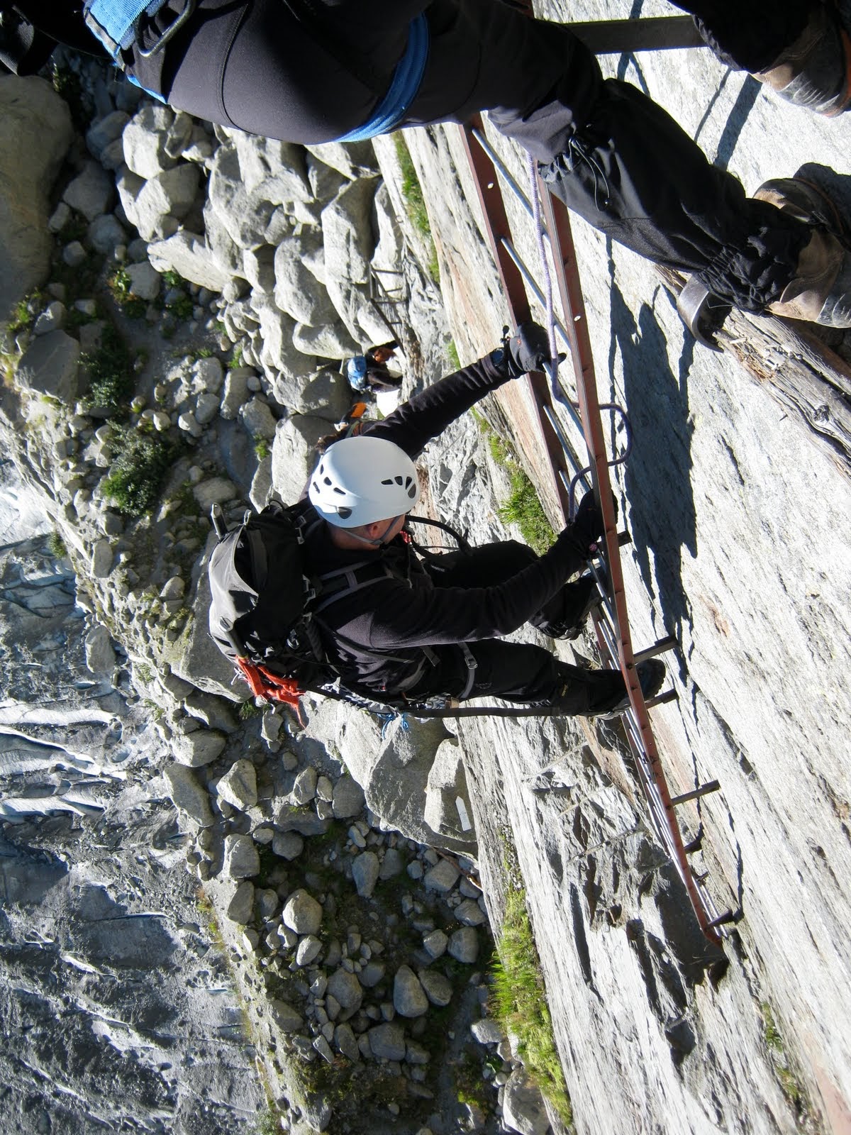 We caught the Montenvers furnicular railway up to the Mer de Glace glacier. The close-up view of the glacier was spectacular, framed by the blue-sky and the majestic peaks, the ice was not the pure white river I was expecting due to a liberal coating of glacial moraine. The actual glacier was now some 200m below us though the flanks of the valley clearly showed the glacier had once been much higher. After a short walk down a path we donned harness and helmets for the 200m descent down a succession of vertical ladders and cables to eventually reach the level of the glacier. We picked our way over the moraine and onto the glacier proper, heading up the valley to spend the morning perfecting crampon and ice-axe technique. After lunch we headed further up the glacier to practice some ice-climbing. A leisurely descent is usual after a long day in the UK hills, so the prospect of ascending the ladders after a long hot day in the sun was not welcomed. They were like a giant stepper-machine - rung after rung it went on, my grip slightly more tense, my foot placement slightly more precise as we slowly gained height. The train was a far leisurely way down the mountain and we eventually plonked ourselves in the Icicle office at 5.30 for tea/biscuits and an hours instruction on knots.